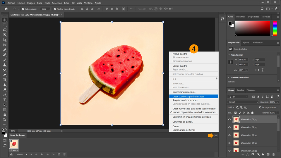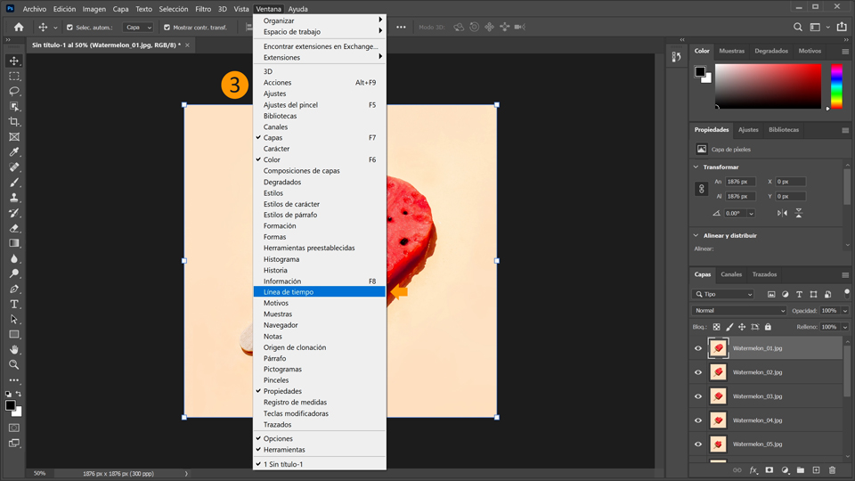 3. A continuación, abre la línea de tiempo. Ve a Ventana > Línea de tiempo. De forma predeterminada, Photoshop añade el primer cuadro en el panel Línea de tiempo.