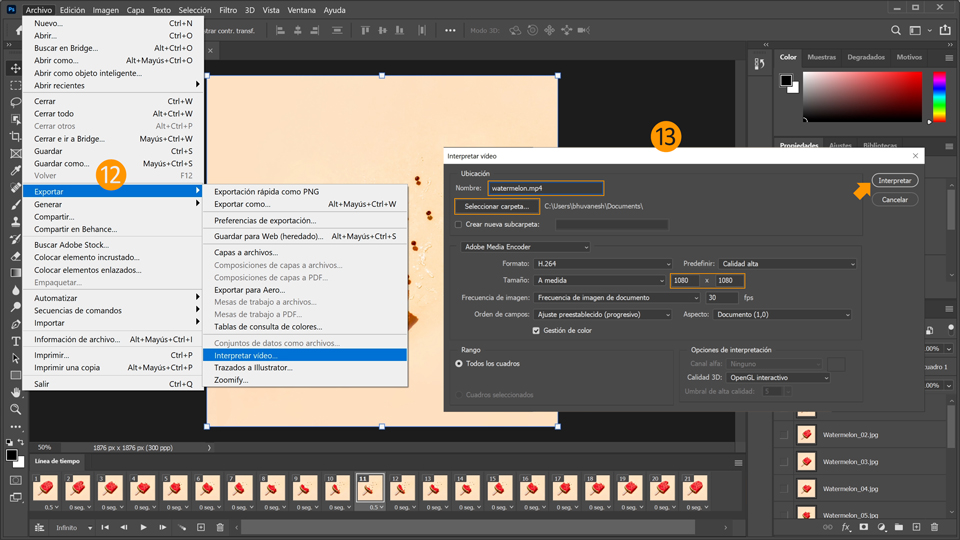 12. Guarda la animación como vídeo para Instagram. Elige Archivo > Exportar > Interpretar vídeo.