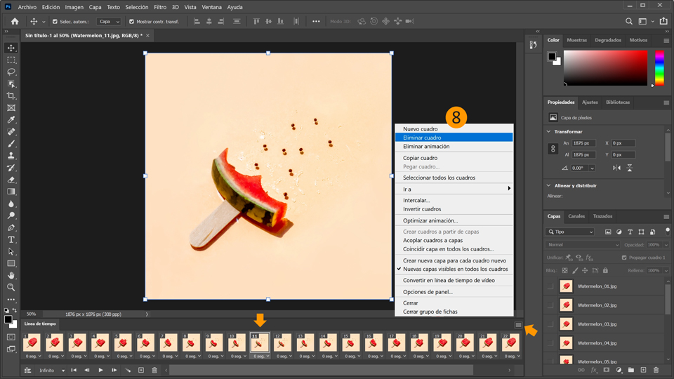 8. Del cuadro 1 al 11, la sandía va desapareciendo y, del cuadro 12 al 22, esta se vuelve a reconstruir. Como los cuadros 11 y 12 son iguales, elimina el cuadro duplicado del centro de la animación. Haz clic en el cuadro 12 y elige Eliminar cuadro en el menú.