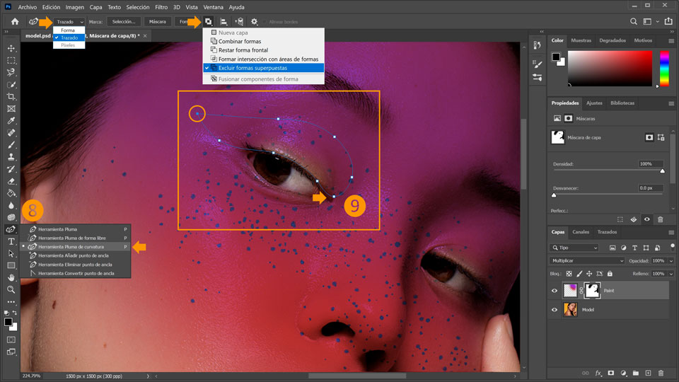 8. A continuación, crea una sombra de ojos elegante. Para ello, selecciona la herramienta Pluma de curvatura y define el modo con el valor Trazado y, la operación de trazado, con el valor Excluir formas superpuestas.