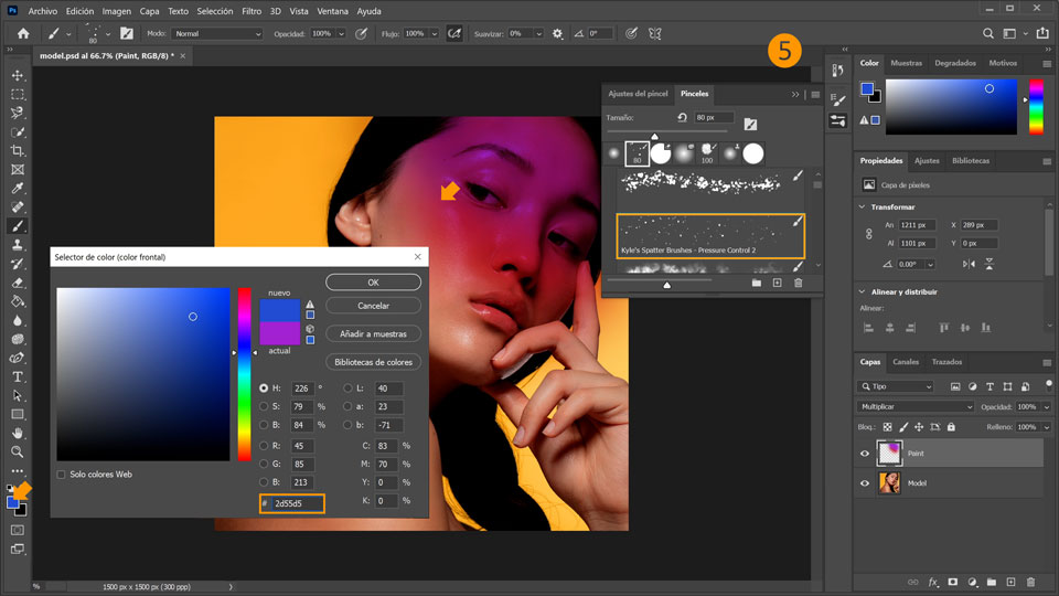 5. Ahora, selecciona un color azul (#2d55d5), accede a Ventana > Pinceles para abrir el panel Pinceles y selecciona Kyle’s Spatter Brushes – Pressure Control 2 en la carpeta Brushes Special Effects para pintar un patrón de purpurina por las mejillas y la nariz de la modelo.