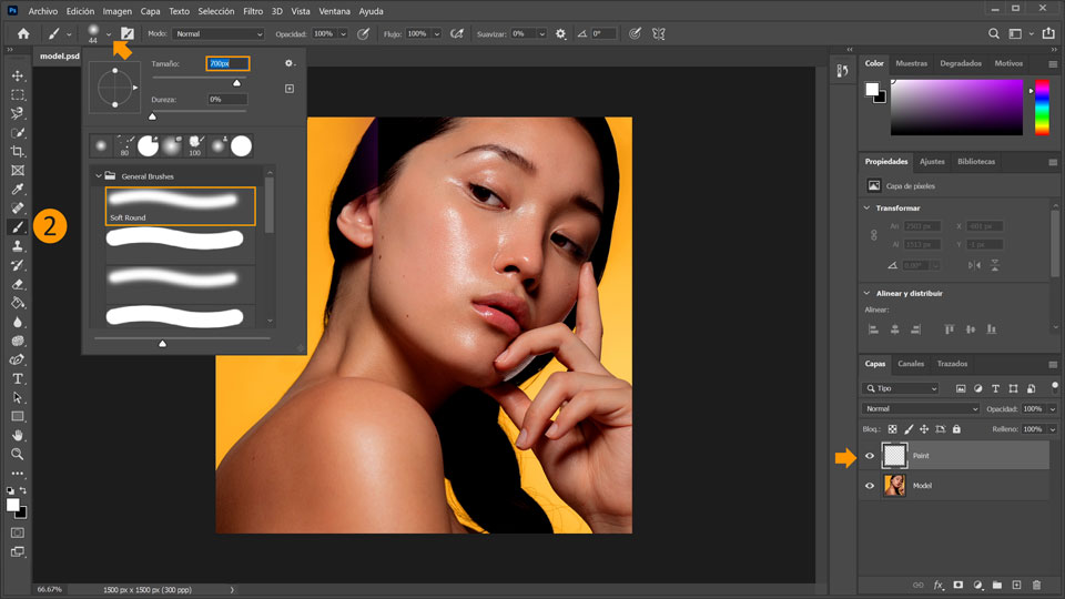 2. Con la capa “Paint” seleccionada, elige la herramienta Pincel (B). Haz clic en la flechita de la barra superior para ajustar los parámetros del pincel. Selecciona una punta suave redondeada y ajusta el tamaño en 700 px.