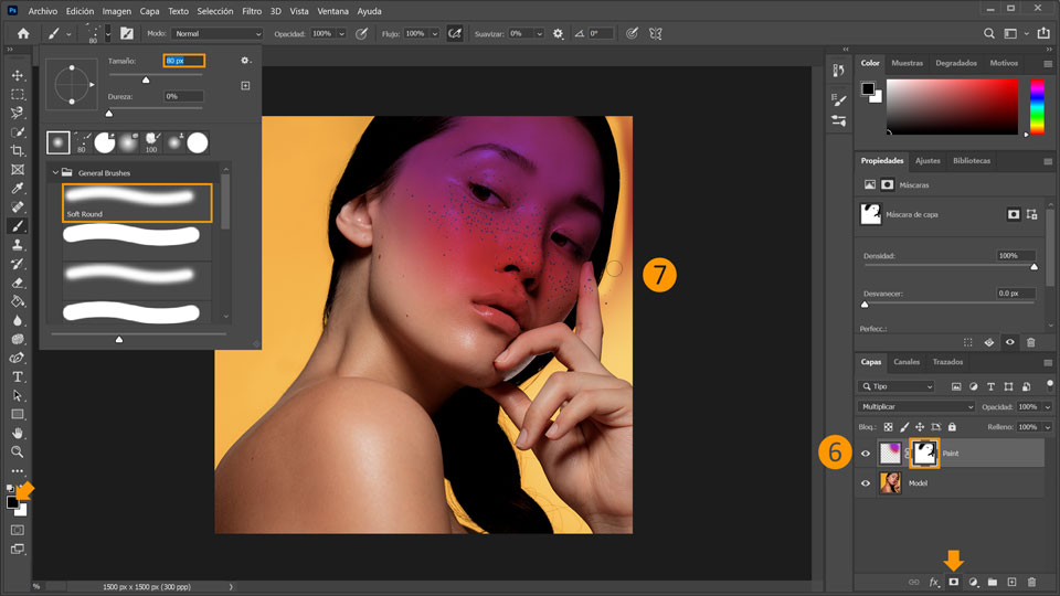 7. Con la herramienta Pincel seleccionada, configura el pincel con una punta suave y redondeada, define el tamaño en 80 px y procura que el color frontal sea negro. Ahora, pinta por encima de los ojos, el pelo y los dedos sobre la máscara para que se asome la imagen original. Si es preciso, elige un pincel más pequeño para trabajar con una mayor precisión.