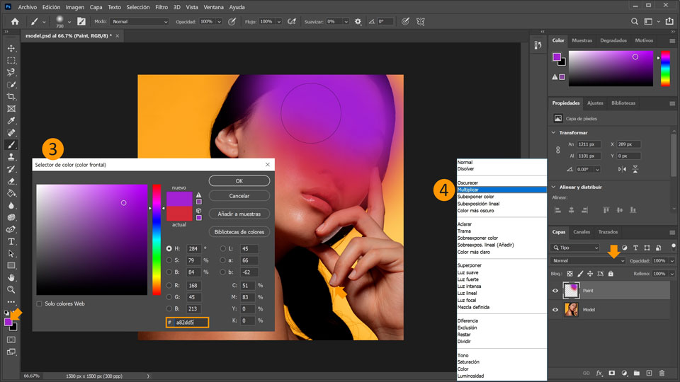 4. Define la capa Modo de fusión con el valor Multiplicar para que la pintura se “funda” con la piel.