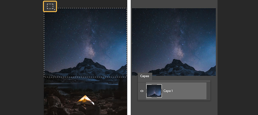 Usa la herramienta Marco rectangular para hacer una selección aproximada del cielo. Después, pulsa Control+C (Windows) o Comando+C (macOS) para copiarlo. Crea un nuevo archivo (Archivo > Nuevo) y usa Control+V o Comando+V para pegar la capa.