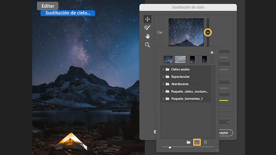 Vuelve a la imagen original y elige Editar > Sustitución de cielo. Haz clic en la miniatura Cielo y, después, haz clic en el botón + para importar el archivo con la imagen del cielo que acabas de guardar.