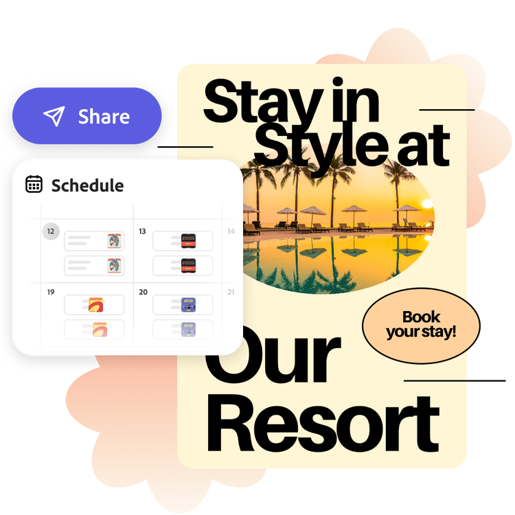 Successful ads don’t feel like ads at all. To get started, find a high-quality image for inspiration. For example, a dreamy photo of your resort can convince a prospective visitor to download your vacation brochure. Best of all, you can use the Adobe Express Content scheduler to post to all your social media channels. Nail your marketing campaign initiatives with the help of Ad Maker, your one-stop-shop.
