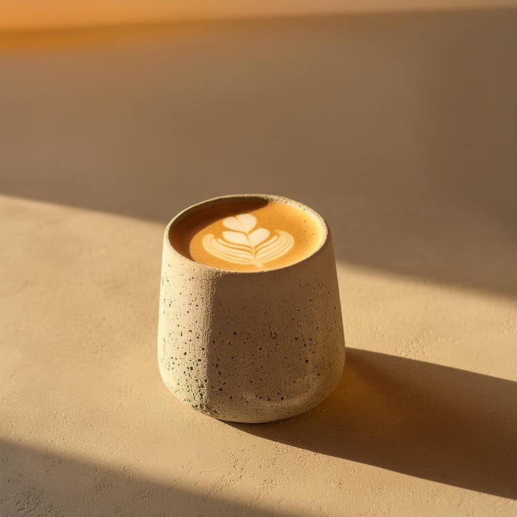 latte in smooth stone mug with shadow; latte art; neutral beige concrete counter