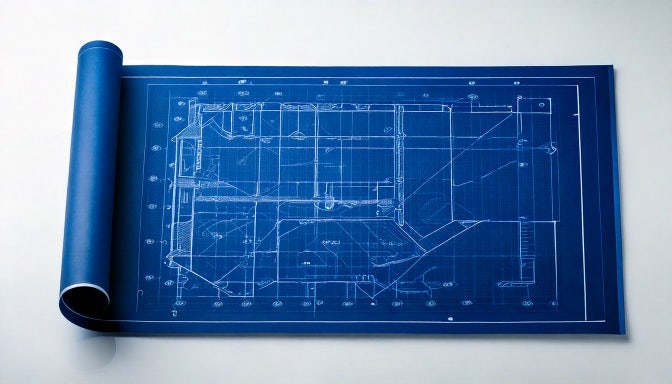 a dark blue blueprint on white glass background