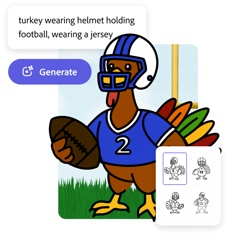 Design Thanksgiving coloring pages that fit your kids’ personality and interests. Try asking them what they’re thankful for or what their favorite Thanksgiving food is and turn that into a coloring page. Use Adobe Express AI generated coloring pages as a way to connect and have fun this holiday season.
