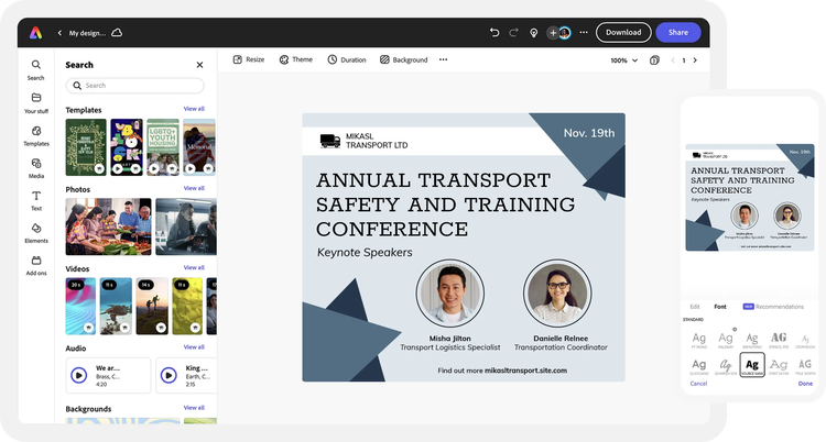 Add your own photos or videos and start your creation from there. You can also import your PSD or Ai files and Adobe Express will recognize all of your layers.