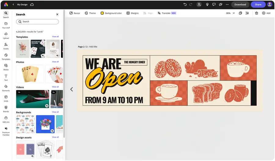 Explore professionally designed templates to get your wheels spinning or create your business banner from scratch. Establish a theme for your designs using photos, icons, logos, personalized fonts, and other customizable elements to make them feel entirely authentic. With Adobe Express, it's free and easy to make, save, and share your designs within minutes.