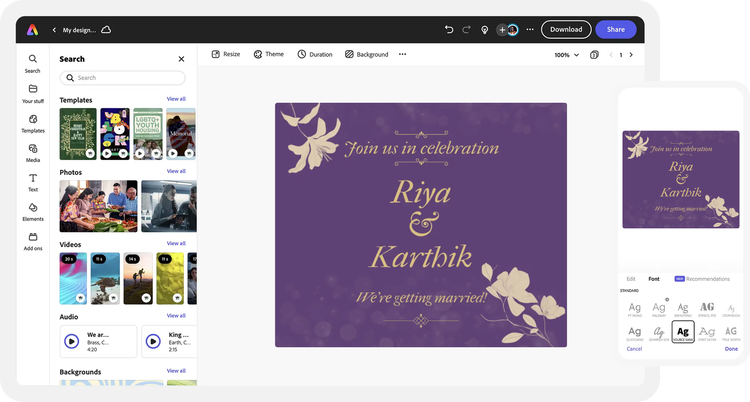 Design and send off beautiful wedding banners effortlessly with the Adobe Express online editor. No experience required.