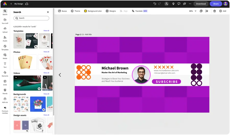 Explore professionally designed templates to get your wheels spinning, or create your own channel art for YouTube from scratch. Establish a theme for your designs using photos, icons, logos, personalized fonts, and other customizable elements to make them feel entirely authentic. With Adobe Express, it's free and easy to make, save, and share your designs within minutes.