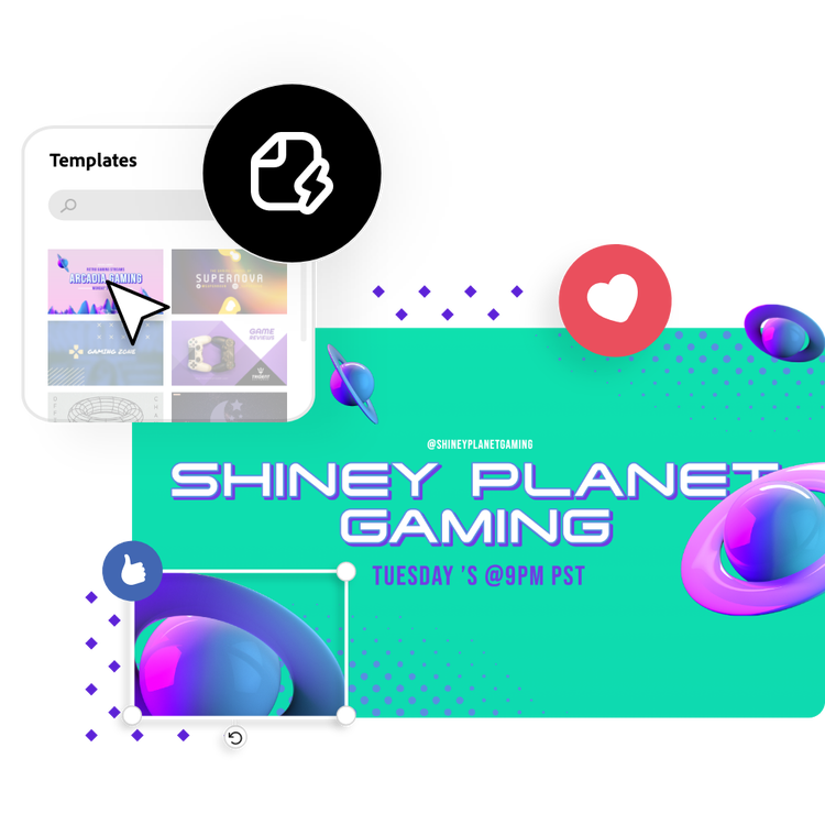 Hone your creativity with the power of Adobe Express. Explore professionally designed templates to get your wheels spinning or create your gaming channel art from scratch. Establish a theme for your designs using photos, icons, logos, personalized fonts, and other customizable elements to make them feel entirely authentic. Duplicate designs and resize them to create consistency across multiple types of assets.
