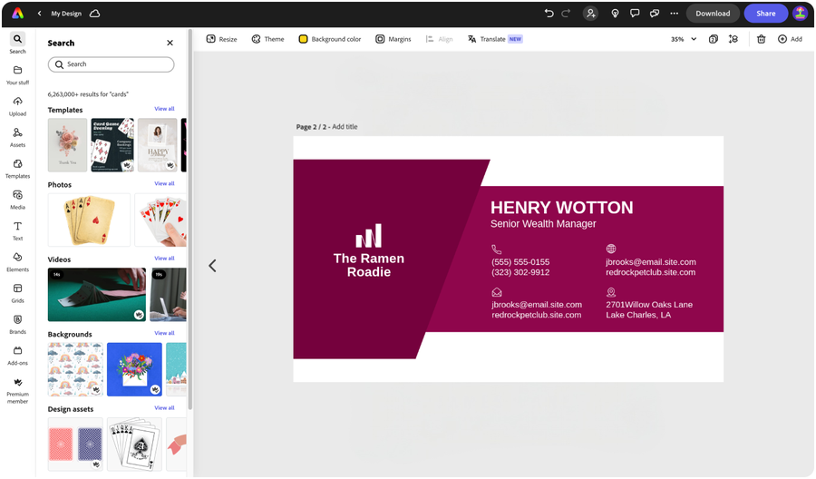Open Adobe Express for free on your desktop or mobile device to start creating your visiting card.Explore professionally designed templates.