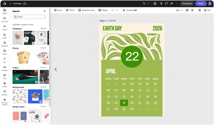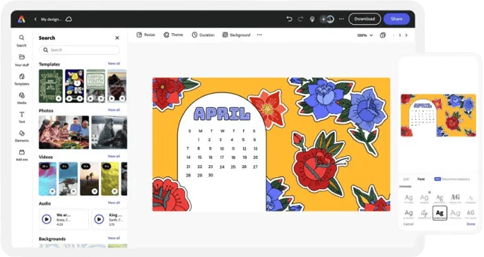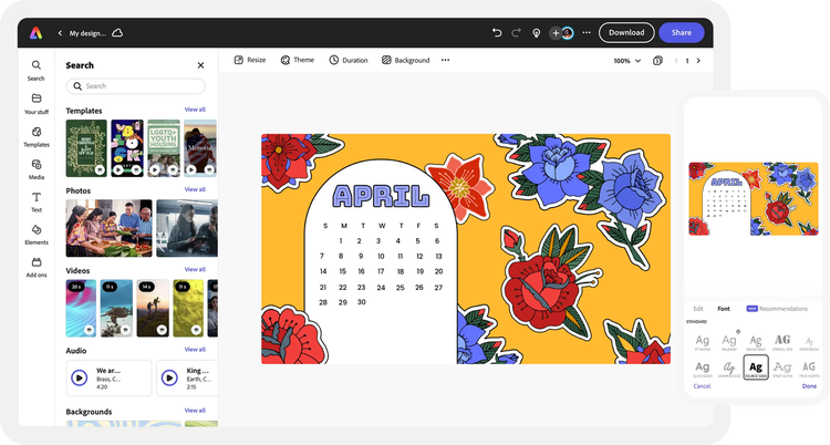 Explore professionally designed April calendar templates to get your wheels spinning or create yours from scratch. Establish a theme for your designs using photos, icons, logos, personalized fonts, and other customizable elements to make them feel entirely authentic. Duplicate designs to create consistency across months. Add, delete, or modify cells in the table to suit your needs. With Adobe Express, it’s free and easy to make, save, and share your designs within minutes.