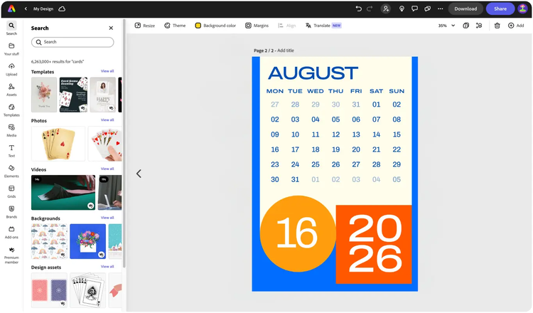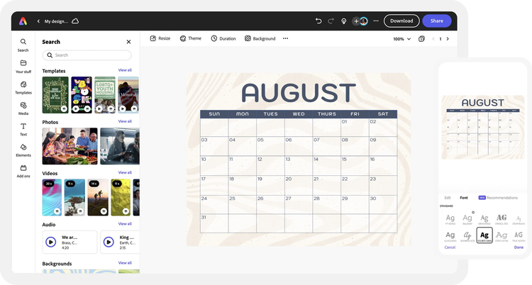 Explore professionally designed templates or create your August calendar from scratch. Set your theme with photos, icons, logos, fonts, and other customizable elements for a truly authentic look. Duplicate and resize designs for consistent assets, and easily edit table cells to fit your needs. With Adobe Express, it’s free and simple to make, save, and share your designs in minutes.