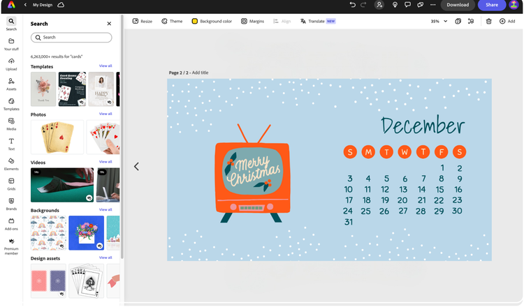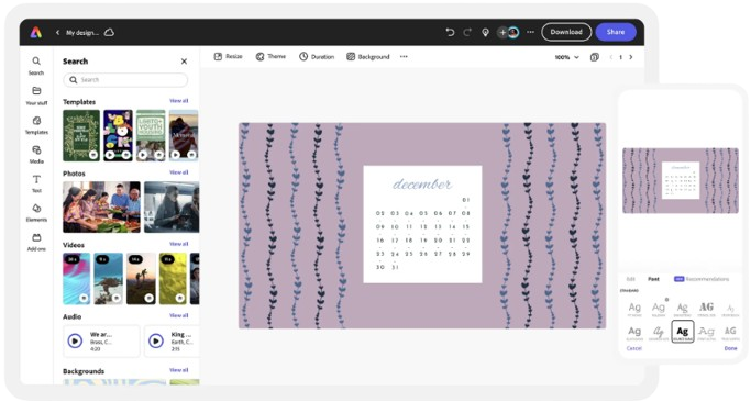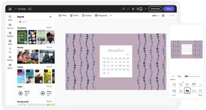 Explore professionally designed templates to get your wheels spinning or create your calendar from scratch. Establish a theme for your designs using photos, icons, logos, personalized fonts, and other customizable elements to make them feel entirely authentic. Duplicate designs and resize them to create consistency across multiple types of assets. With Adobe Express, it’s free and easy to make, save, and share your designs within minutes.