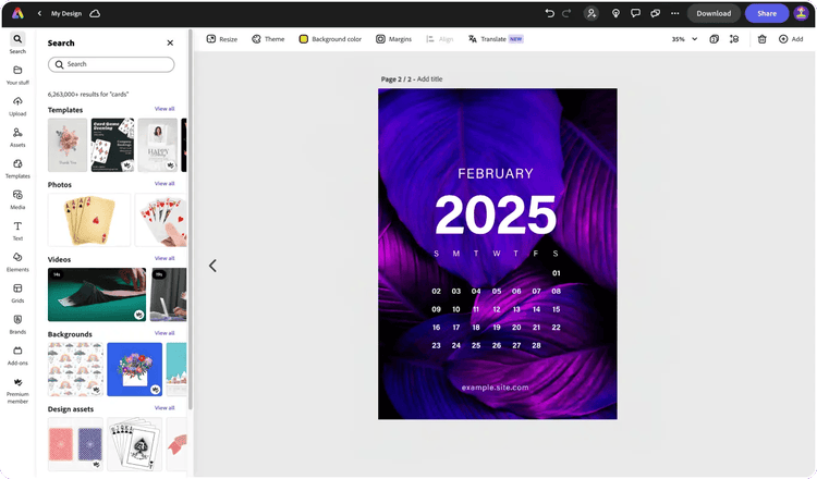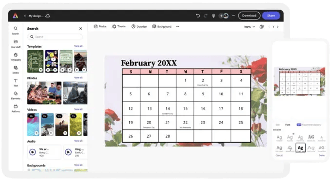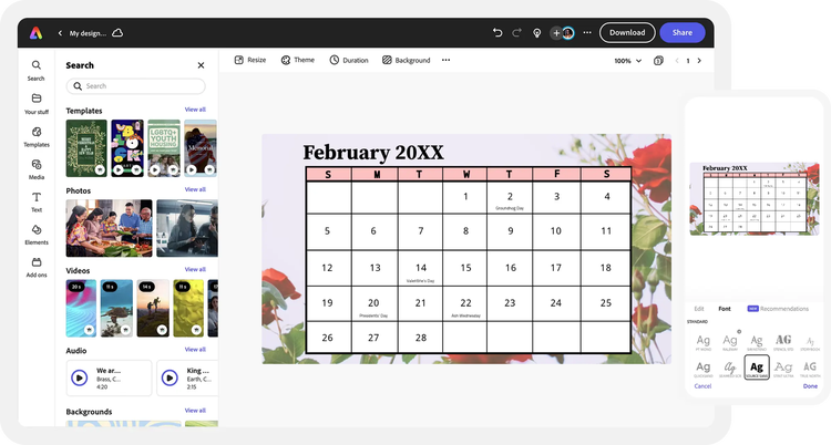 Explore professionally designed templates to get your wheels spinning or create your calendar from scratch. Establish a theme for your designs using photos, icons, logos, personalized fonts, and other customizable elements to make them feel entirely authentic. Duplicate your February calendar design to create more monthly calendars with a consistent look. With Adobe Express, it’s free and easy to make, save, and share your designs within minutes.