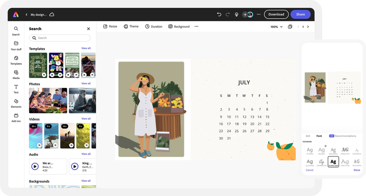 Explore professionally designed templates to get your wheels spinning or create a July calendar from scratch. Establish a theme for your designs using photos, icons, logos, personalized fonts, and other customizable elements to make them feel entirely authentic. Duplicate designs and resize them to create consistency across multiple types of assets. Add, delete, or modify cells in the table to suit your needs. With Adobe Express, it’s free and easy to make, save, and share your designs within minutes.