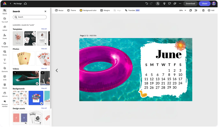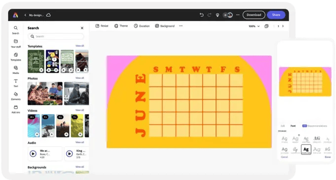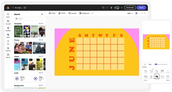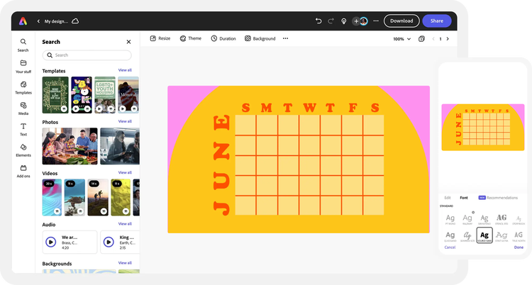 Explore professionally designed templates to get your wheels spinning or create your June calendar from scratch. Establish a theme for your designs using photos, seasonal icons, logos, personalized fonts, and other customizable elements to make it feel authentic. Duplicate designs and resize them to create consistency across multiple types of assets. With Adobe Express, it’s free and easy to make, save, and share your designs within minutes.