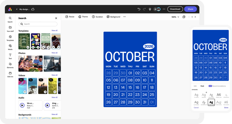 Explore professionally designed templates or create your October calendar from scratch. Set your theme with photos, icons, logos, fonts, and other customizable elements for a truly authentic look. Duplicate and resize designs for consistent assets, and easily edit table cells to fit your needs. With Adobe Express, it’s free and simple to make, save, and share your designs in minutes.