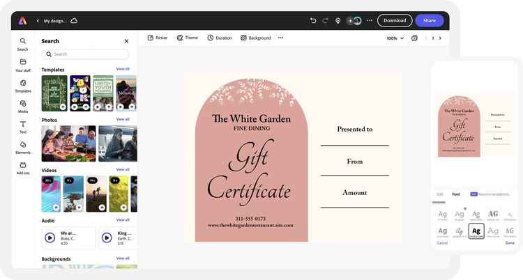 Beautiful, versatile gift certificates. Adobe Express can help you with that.
