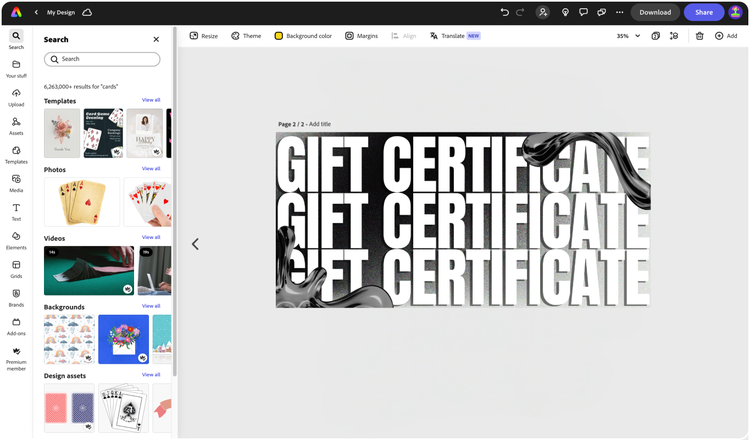 Explore professionally designed templates to get your wheels spinning or create your gift certificate from scratch. Establish a theme for your designs using photos, icons, logos, personalized fonts, and other customizable elements to make them feel entirely authentic. With Adobe Express, it’s free and easy to make, save, and share your designs within minutes.