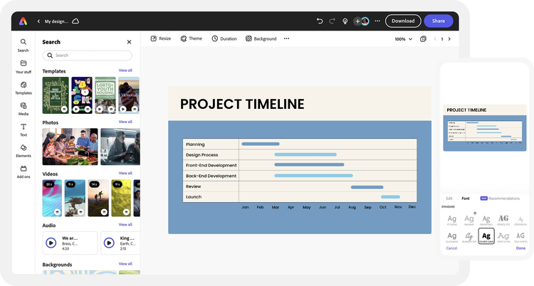 Complement your Gantt chart with high-quality images, videos, and fonts from Adobe Stock and Adobe Fonts as well as one-click animations, icons, and shapes. Perfect for completing presentations alongside your Gantt chart. If you don’t know what looks best, Adobe Express gives you tons of curated font recommendations and color schemes to mix and match.