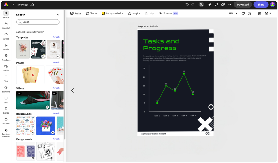Add your own photos or videos and start your creation from there. You can also import your PSD or Ai files and Adobe Express will recognize all of your layers.