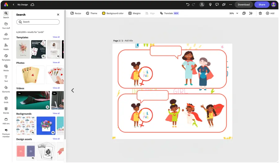 Hone your creativity with the power of Adobe Express. Explore professionally designed templates to get your wheels spinning or create your comic strip format from scratch. Establish a theme for your designs using photos, icons, logos, personalized fonts, and other customizable elements to make them feel entirely authentic. Duplicate designs and resize them to create consistency across multiple types of materials.