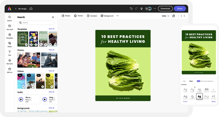 Add your own photos or videos and start your creation from there. You can also import your PSD or Ai files and Adobe Express will recognize all of your layers.