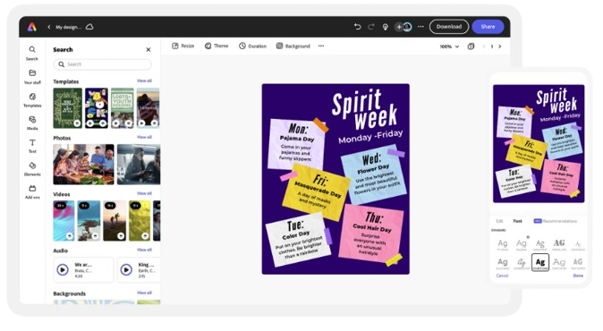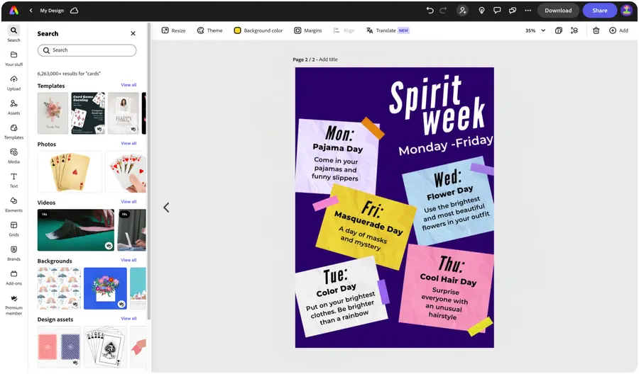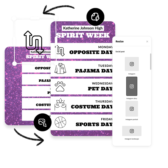 Explore professionally designed templates to get your wheels spinning, or create your own Spirit Week project from scratch. Establish a theme for your designs using photos, icons, logos, personalized fonts, and other customizable elements to make them feel entirely authentic to your school. With Adobe Express, it’s free and easy to make, save, and share your designs within minutes.