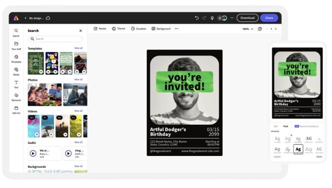 Add your own photos or videos and start your creation from there. You can also import your PSD or Ai files and Adobe Express will recognize all of your layers.
