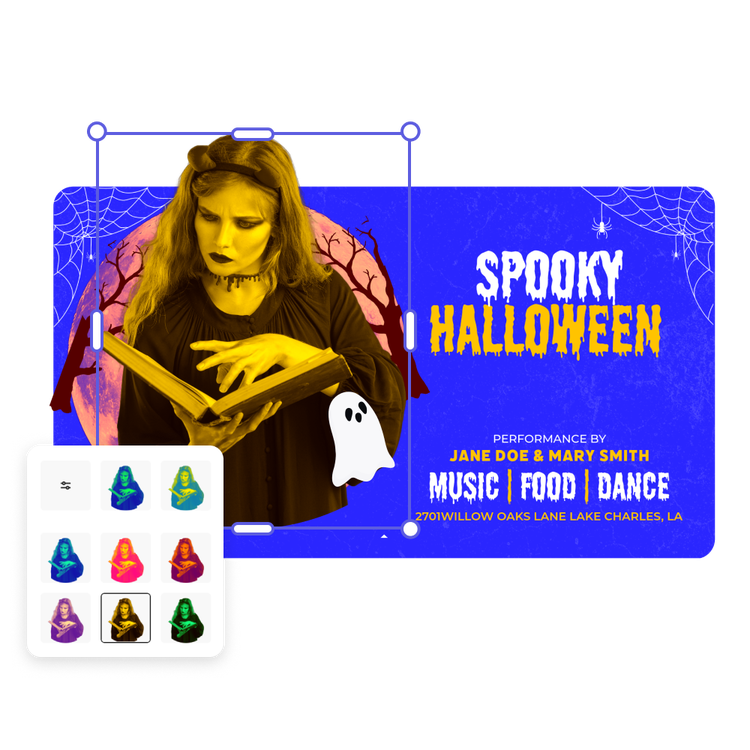 Whether you're a social media manager for an event production company or the owner of boutique costume store, quickly create captivating GIFs that entice your audience to come in for the Halloween season. Create stunning GIFs that highlight your holiday decor or make a meme that riffs on the latest trending scary movie. Share your spooky creation on social media, your website, or email newsletter.