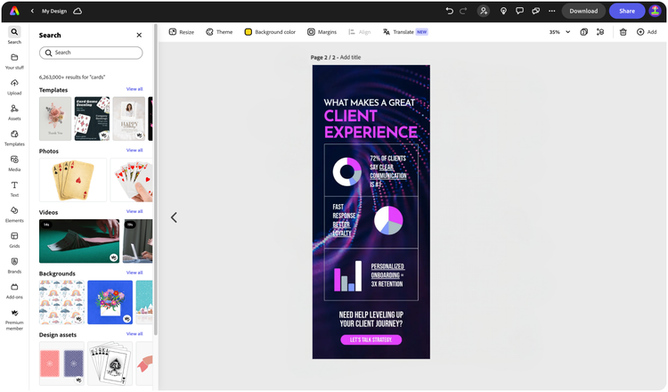 Add your own photos or videos and start your creation from there. You can also import your PSD or Ai files and Adobe Express will recognize all of your layers.