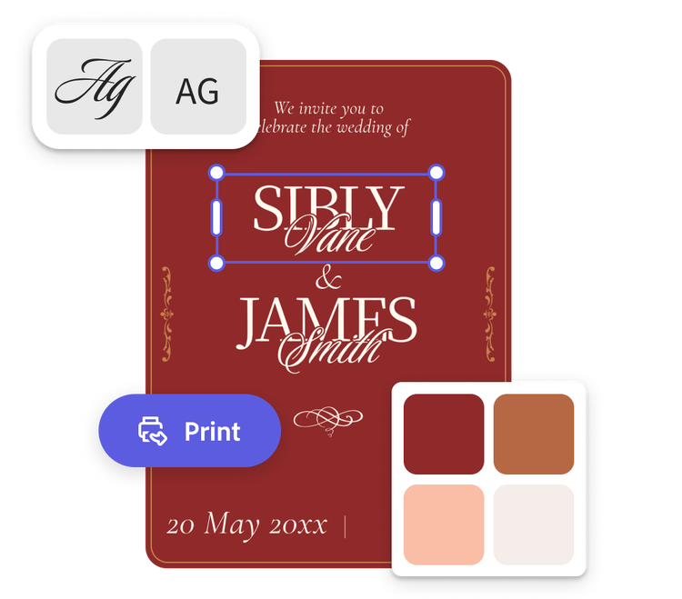 Before you know it, you’ve created an invitation that perfectly encapsulates your hopes for the special day. Take your design a step further by ordering high quality professional prints. If you’re a US, UK, Australia or Canada Adobe Express desktop user, select Print to see our Print and deliver options. Whether you have hundreds of guests or just a few for an intimate ceremony, your invitations are covered in Adobe Express.