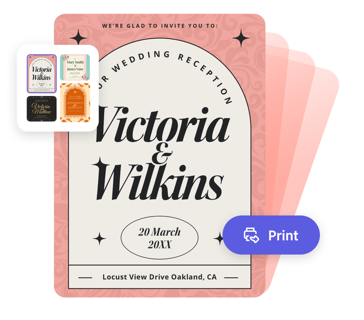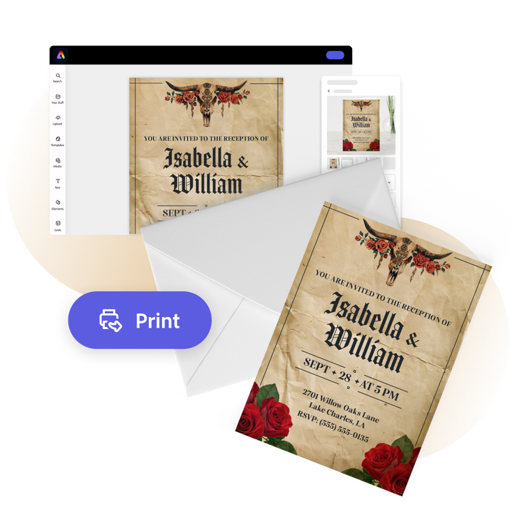It’s easy to go from design to print when using the wedding reception invitation maker. Once you’ve created an invitation that perfectly encapsulates your hopes for the special day, select Print to get started on the final step. If you’re a US, UK, Australia or Canada Adobe Express user, you can order high quality professional prints straight from the app. Whether you’re planning to have hundreds of guests or just a few for a destination reception, your invitations are covered in Adobe Express.