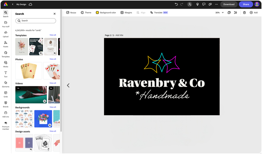 Explore professionally designed templates to get your wheels spinning or create your clothing label from scratch. Establish a theme for your designs using photos, icons, logos, personalized fonts, and other customizable elements to make them feel entirely authentic. With Adobe Express, it's free and easy to make, save, and share your designs within minutes.