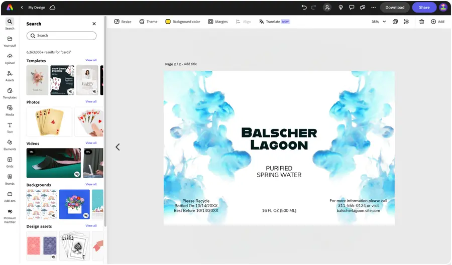 Explore professionally designed templates to get your wheels spinning or create your water bottle label from scratch. Establish a theme for your designs using photos, icons, logos, personalized fonts, and other customizable elements to make them feel entirely authentic. With Adobe Express, it’s free and easy to make, save, and share your designs within minutes so you can add collaborators, get approval, and stay hydrated in style. design and re-size it for a new project.