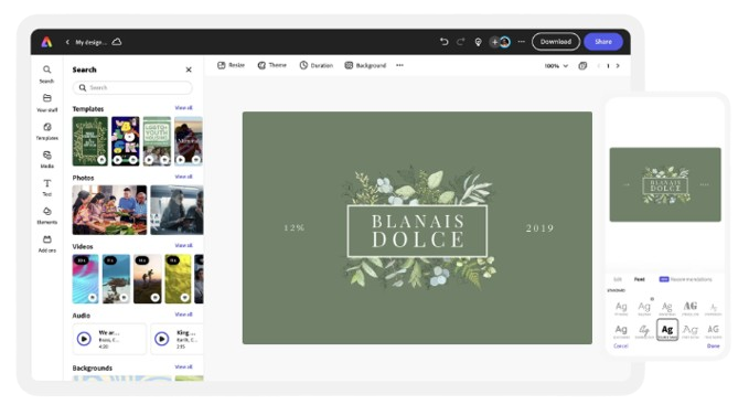 Add your own photos or videos and start your creation from there. You can also import your PSD or Ai files and Adobe Express will recognize all of your layers.