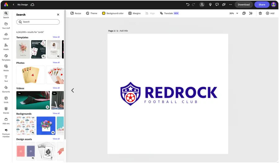 When you’re finished, download high-quality PNG and JPG files of your new soccer logo. Upload your logo to the Brands section in Adobe Express to instantly apply it to future designs. Feature your logo on flyers, business cards, merchandise, marketing materials, social media, and anything else you can dream of.