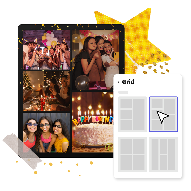 Craft vibrant and festive birthday photo collages with Adobe Express. Upload a collection of birthday memories in one go and watch as they’re stitched together into a stunning collage. Designing your collage is as easy as blowing out birthday candles.