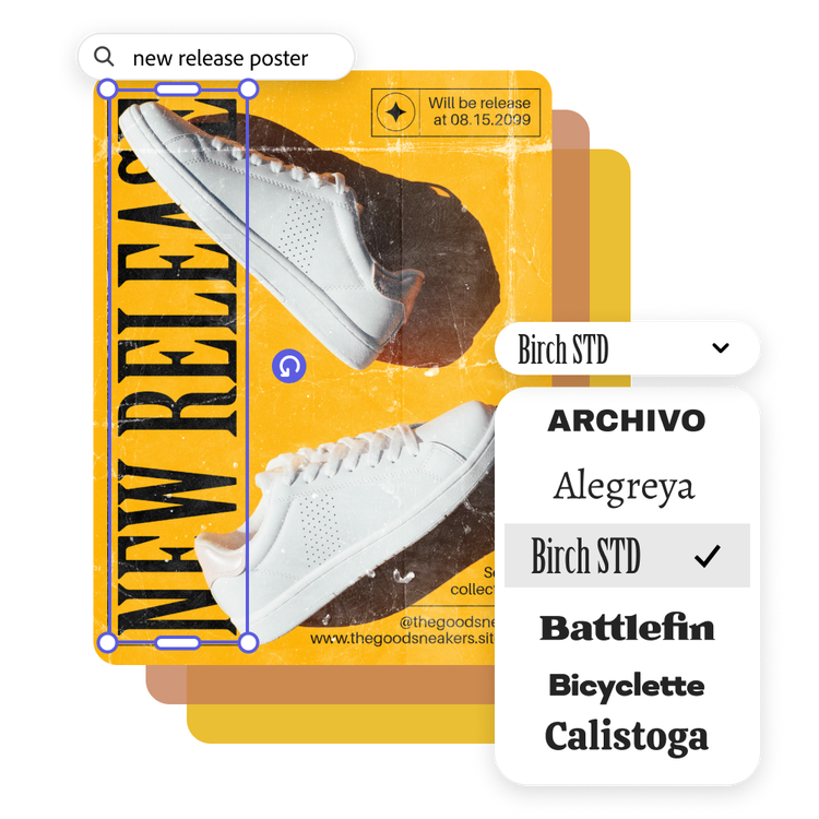 Add your message and change the font by clicking the text box. Upload photos and apply a color scheme. Go to the full Adobe Express editor to access free Adobe Stock images, icons, and more to further customize your poster.