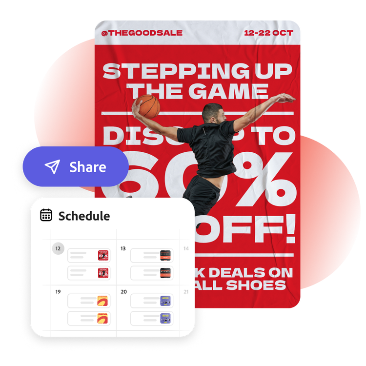 Successful poster ads turn heads, literally. To get started creating your show-stopping poster, find a high-quality image for inspiration. For example, a bright image of a sunflower can draw passersby into your flower shop for a special sale. For more reach, resize your poster ad to fit the dimensions of your social channels, then use the And Adobe Express Content scheduler to plan and publish anytime, across multiple platforms.