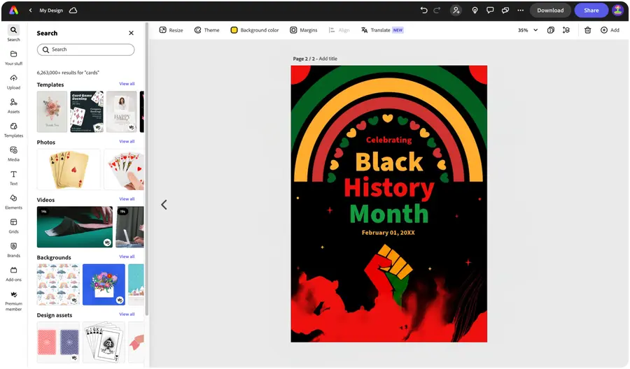 Explore professionally designed templates or create your Black History Month poster from scratch. Establish a theme for your designs using photos, icons, logos, fonts, and other elements to make them feel authentic. Duplicate designs and resize them to create consistency across multiple types of assets. With Adobe Express, it’s free and easy to make designs within minutes.