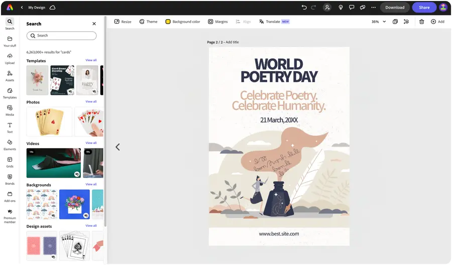 Download your new creative poster as a PDF, JPG, or PNG file to share anywhere. If you’re creating your creative poster using the US, UK, Australia or Canada desktop version of Adobe Express, you can order high-quality prints, delivered to your door.
