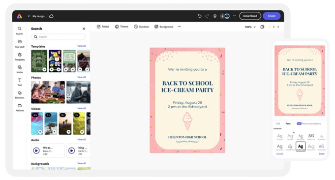 Hone your creativity with the power of Adobe Express. Explore professionally designed templates to get your wheels spinning or design your own ice cream graphic from scratch. Establish a theme for your designs using photos, icons, logos, personalized fonts, and other customizable elements to make them feel entirely authentic. Duplicate designs and resize them to create consistency across multiple types of assets.