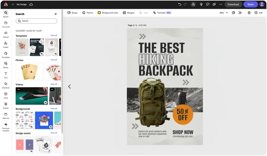Hone your creativity with the power of Adobe Express. Explore professionally designed templates to get your wheels spinning or create your own product photo from scratch. Establish a theme for your designs using photos, icons, logos, personalized fonts, and other customizable elements to make them feel entirely authentic. Duplicate designs and resize them to create consistency across multiple types of assets.
